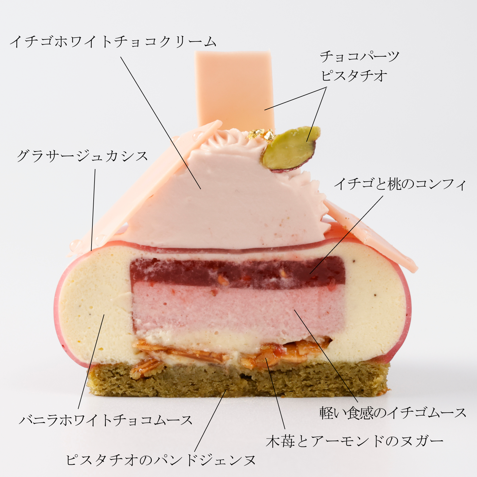 バニラホワイトチョコムースにイチゴピーチのコンフィとイチゴクリーム、ピスタチオのビスキュイとベリーキャラメルアーモンド