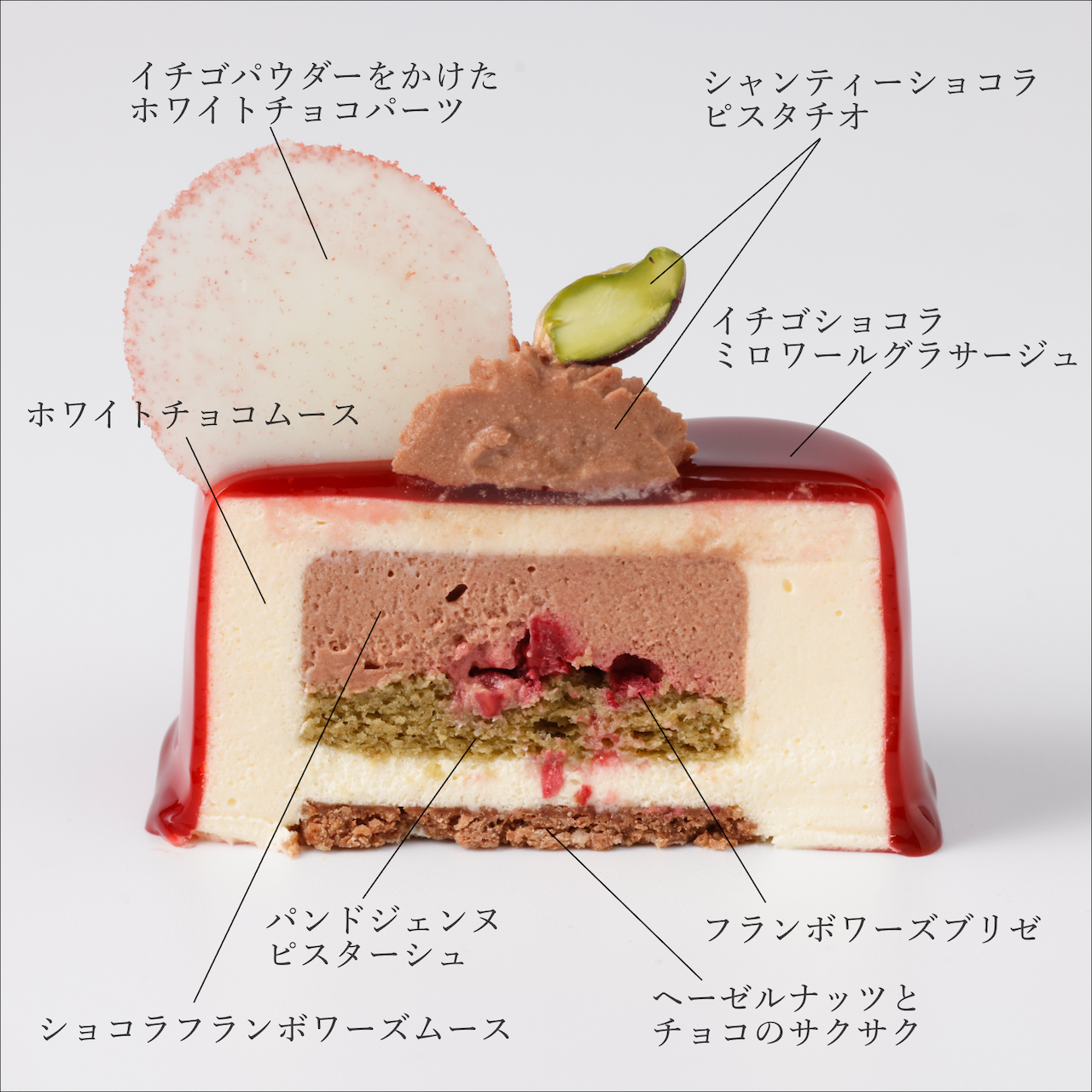 ホワイトチョコムースにフランボワーズとショコラのムースクリーム、ピスタチオ生地とヘーゼルナッツショコラのフィヤンティーヌ